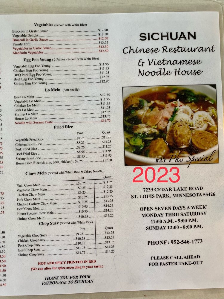 Sichuan Restaurant in St. Louis Park, MN offers a blend of Chinese and Vietnamese cuisine with a diverse menu. Customers rave about the generous portions and delicious flavors. The restaurant is known for its excellent Pho beef noodle soup and various appetizers like fried and steamed dumplings. Reviewers praise the friendly service and reasonable prices. If you're a fan of authentic Chinese food, this spot is a must-visit. Standout dishes include the Princess chicken and tofu Pho, accompanied by fresh sides like bean sprouts and basil. With quick takeout service and ample parking, Sichuan Restaurant is a top choice for Chinese and Vietnamese fare in the area. Whether you're craving orange chicken, beef lo mein, or flavorful egg rolls, this family-owned establishment won't disappoint.